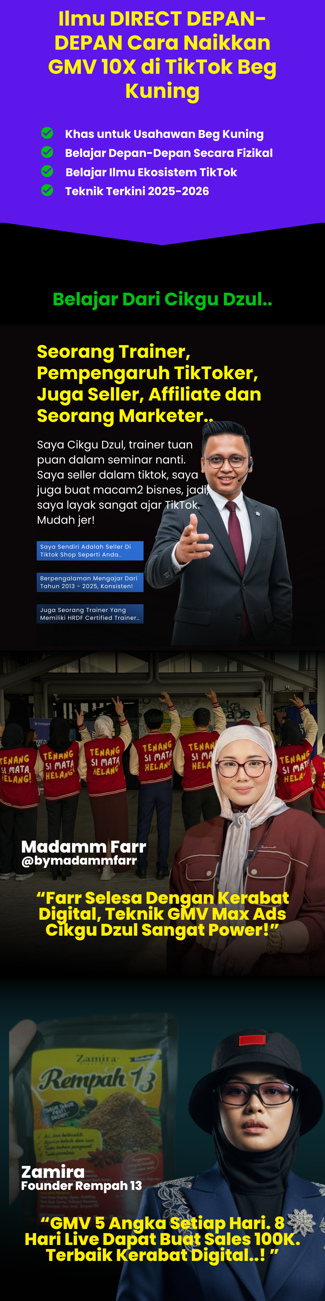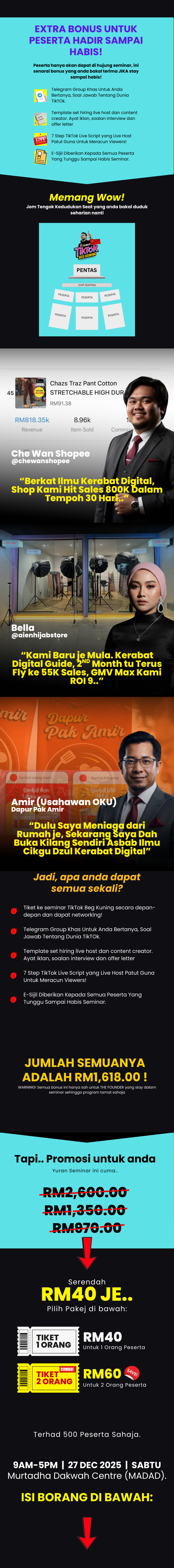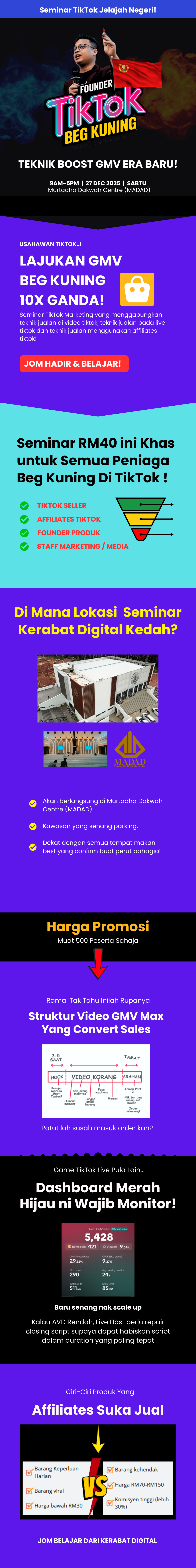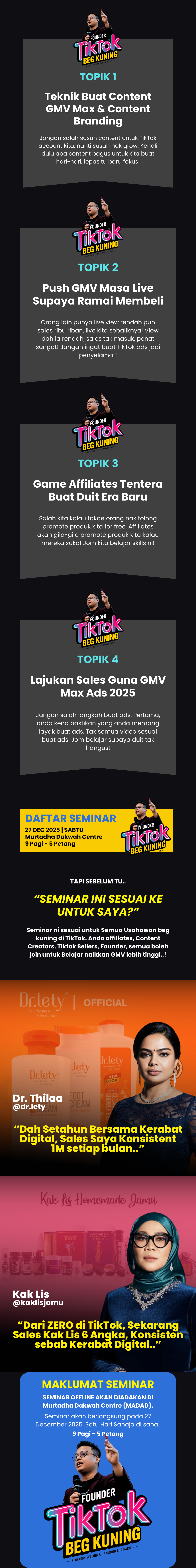 Seminar Fizikal - TikTok Beg Kuning - 27 Dec 2025, Sabtu. 9 Pagi hingga 5 Petang. Lokasi di Murtadha Dakwah Centre (MADAD). Harga promosi tiket cuma RM60 untuk 2 orang.